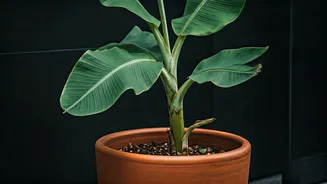 Consistent fertilization supports healthy growth and fruit production. Fertilize your banana plant regularly during the growing season with a balanced fertilizer, following the package directions. Incorporate a slow-release fertilizer into the soil at the start of the season for sustained nourishment. Pruning is key to shaping the plant and getting rid of dead or yellowing leaves. Trim any damaged or dead leaves at the base to improve airflow and prevent disease. Regularly inspect your plant for pests and diseases, such as spider mites or banana weevils. Early detection and prompt treatment are key. Use insecticidal soap or neem oil to control pests if you find them. Re-potting will be necessary as the plant grows and its roots fill the container. Generally, re-pot the plant every one or two years to provide fresh soil and more space for root development.