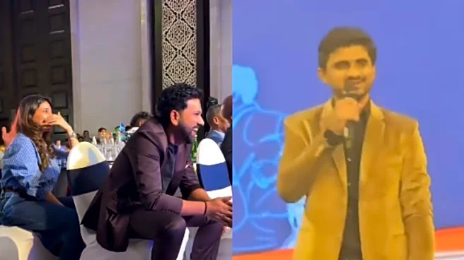 During the ceremony, Rohit, seated beside his wife Ritika Sajdeh, couldn’t contain his laughter as the artist mimicked Dhoni’s tone and demeanor. The two-time ICC trophy-winning captain was seen laughing out loud, even turning towards Ritika, who was laughing and shaking her head at the moment. The video of the couple enjoying the performance went viral. While several cricketing personalities were imitated that evening, it was Dhoni’s impression that grabbed attention.